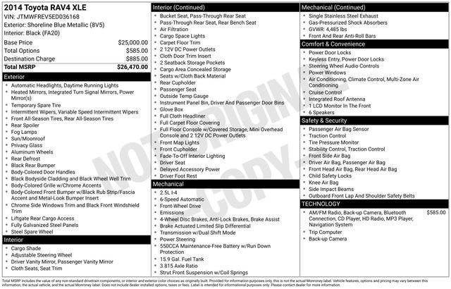 NAVARRE AS IS SPECIALElevate your driving experience with this exceptional 2014 Toyota RAV4 XLE. This versatile crossover SUV offers a remarkable blend of style, performance, and cutting-edge technology, making it the perfect companion for your adventures.Boasting a sleek blue exterior, this RAV4 XLE is equipped with a host of premium features that cater to your every need:- RADIO: ENTUNE DISPLAY AUDIO W/NAVIGATION- 6.1 touch-screen with integrated backup camera display- SiriusXM Radio with 90-day complementary trial- HD Radio with iTunes Tagging- Hands-free phone capability and music streaming via Bluetooth®Step inside and enjoy the comfort of the well-appointed interior, featuring:- Dual-zone automatic climate control- Power windows and remote keyless entry- Steering wheel-mounted audio controls- Spacious cargo area with 60/40 split-folding rear seatsUnder the hood, the 2.5L 4-cylinder DOHC Dual VVT-i engine delivers an impressive 24 city/31 highway MPG, ensuring exceptional efficiency and a smooth, responsive driving experience. The 6-speed automatic transmission and front-wheel-drive configuration further enhance the vehicle's agility and handling.Safety is a top priority, with features like ABS brakes, dual front impact airbags, and an electronic stability control system providing you and your passengers with the utmost protection.Whether you're embarking on a family road trip or navigating the daily commute, this 2014 Toyota RAV4 XLE is the perfect companion. Experience the exceptional quality, performance, and technology that make this crossover a standout in its class.This vehicle is BEING SOLD AS IS at Navarre Chevrolet, 1300 East College Street, Lake Charles, LA 70607. Please call any of our Sales Professionals at 337-474-1999 for more details or to set an appointment.Visit our website http://www.navarreauto.com for more New, Pre-Owned, and Chevrolet Certified Specials!